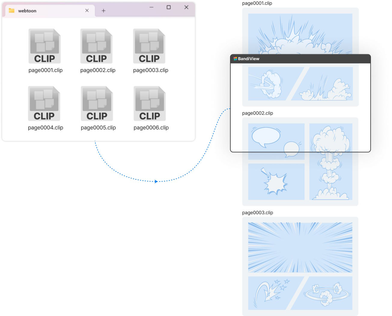 Webtoon View Mode allows you to view all image files in a folder as one vertical flow, just like viewing a webtoon in your web browser. And it is also convenient that you can immediately view Photoshop files (PSD, PSB) or CLIP STUDIO PAINT files (CLIP) you are still working on, with no need to convert them to files in general formats like PNG.